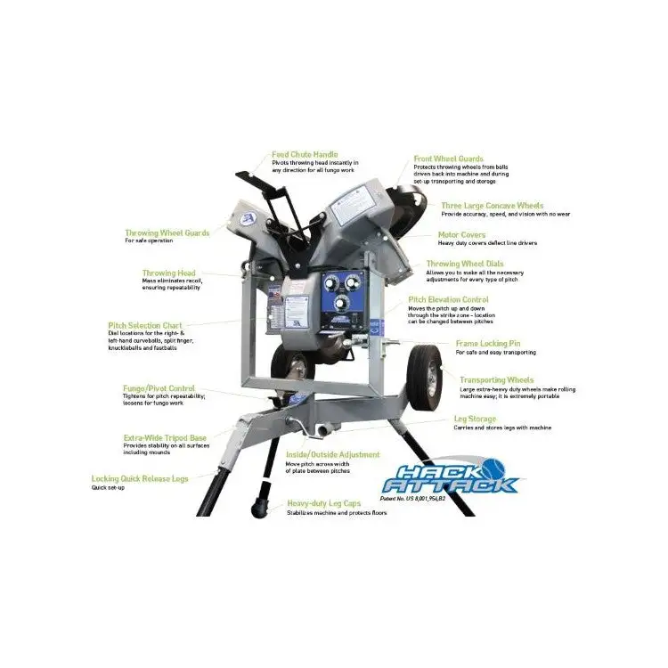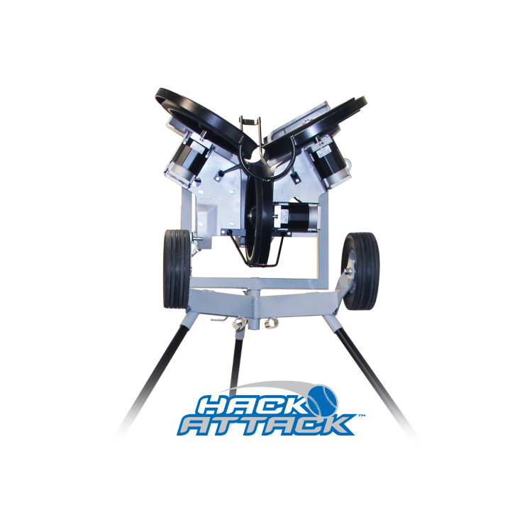 The exclusive three-wheel design of the Hack Attack Baseball Pitching Machine allows the hitter to see the ball clearly all the way through the feeding motion, acceleration and release, just like with a live pitcher. Throws pitches 60 feet @ 100+ MPH. Machine comes fully assembled, including baseball legs.