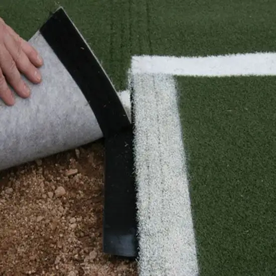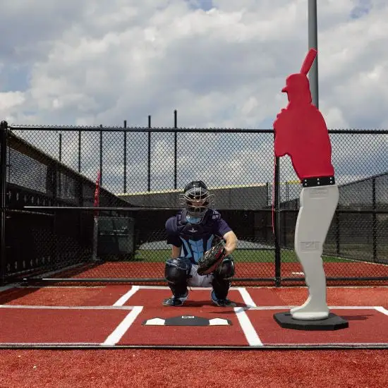 Clay Batting Mat Pro with Catcher’s Extension is perfect for both indoor and outdoor use. Offers complete floor protection with a foam backing. Durable turf is designed to be spike-resistant. Use for batting practices and before game warmups. Batter’s Box lines are inlaid so they won’t flake or fade. Batting mat is easy to store and move around. This model comes complete with a movable home plate, allowing users to rotate the mat and extend its life. Catcher’s extension allows for a live catcher to practice without damaging gym floors or digging up the home plate area. Extension attaches and removes easily with Velcro. Clay batting mat pro with inlaid white lines and catcher’s extension.
